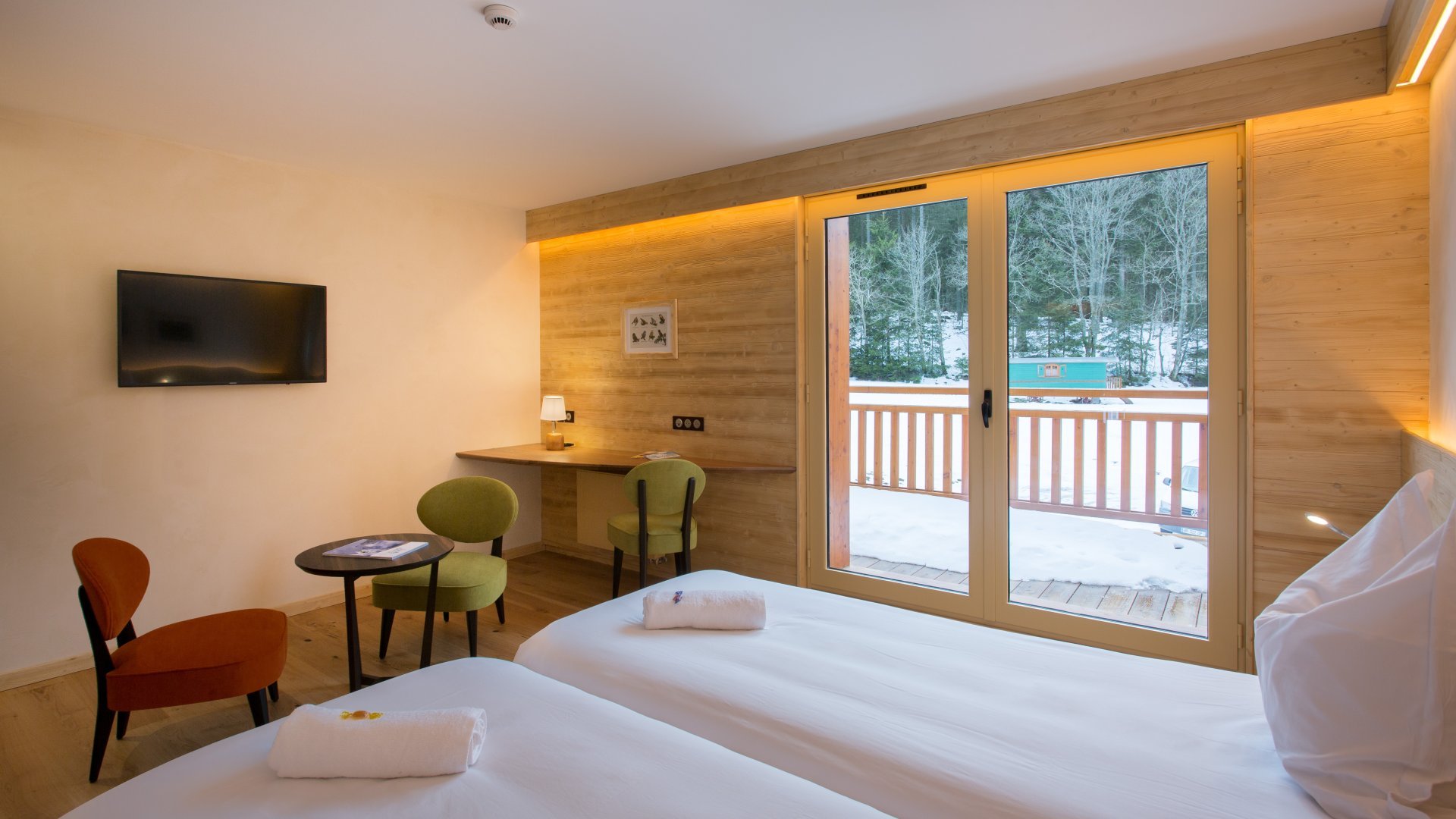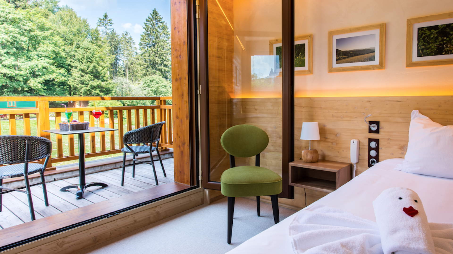 L’établissement propose divers types d’hébergement pour répondre à tous les budgets et toutes les envies, des plus romantiques aux plus originales. Les 28 chambres de l’hôtel, habillées de bois clair et de tissus blanc inspirent le calme et la douceur. Derrière l’hôtel, la Résidence des Étoiles permet de profiter d’un séjour en famille ou entre amis, en parfaite autonomie grâce à ses quatre appartements. Un peu plus loin, à l’entrée des bois, une roulotte est disponible pour un séjour romantique à deux.